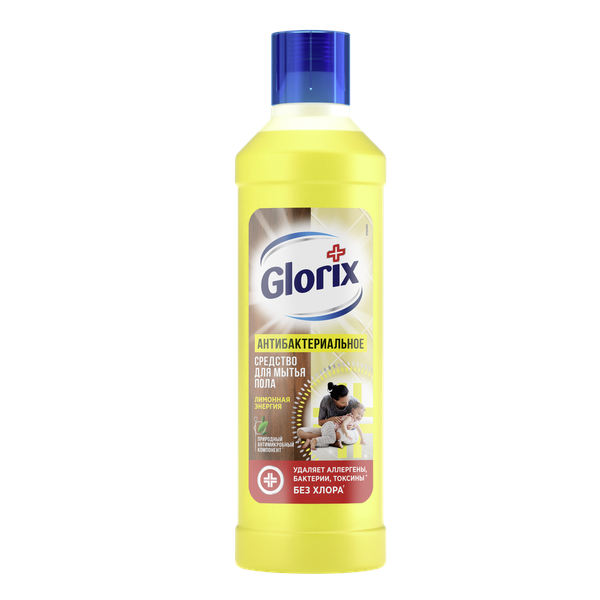 Глорикс средство для мытья пола лимонная энергия 1 лЖидкость для мытья пола Лимонная энергия содержит в составе натуральные эфирные масла и бензалкония хлорид и помогает поддерживать блеск и чистоту любых поверхностей в доме. для пола не содержит спирт или хлор, мгновенно высыхает, не оставляет на полу мыльных разводов и не требует смывания. Глорикс для мытья полов эффективно борется не только с бактериями и грязью, но и с аллергенами, что крайне актуально в весенне-летний период или если дома есть животные. Жидкость Глорикс безопасна для детей и домашних животных. Лимонная энергия подходит для очищения различных поверхностей: столов, стульев, мебели, сантехники и даже игрушек. Жидкость для мытья пола Лимонная энергия: -не содержит хлора; -смывает аллергены (пыль и пыльцу); -способствует устранению бактерий; -оставляет приятный свежий аромат; -быстро высыхает, не оставляет разводов, не требует смывания; -подходит для ежедневного очищения различных поверхностей и предметов (рабочее пространство, стол, стулья, мягкие игрушки); -одобрена дерматологами. Чистящее средство для мытья пола может использоваться для любых покрытий: ламината, линолеума, деревянных полов, паркета.