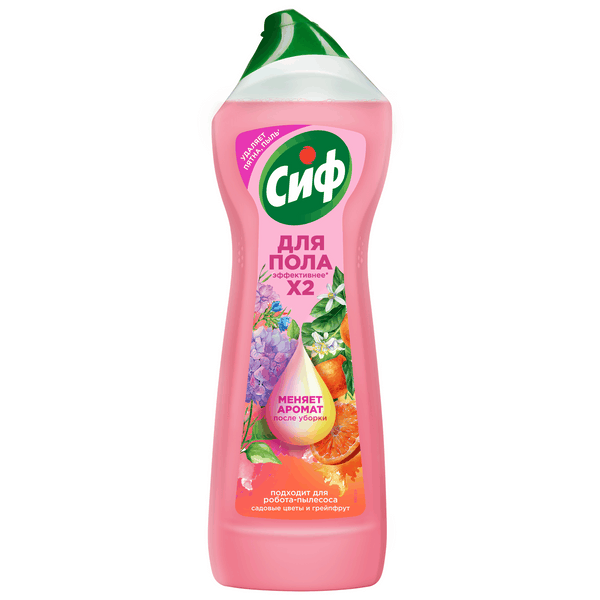 Сиф гель концентрат средство для мытья пола антипыль садовые цветы и грейпфрут 750 млСредство для мытья пола Сиф — это идеальное решение для уборки дома, которое сочетает в себе высокую эффективность и приятный аромат. Разработанная с использованием инновационных технологий, эта жидкость для мытья полов в 2 раза эффективнее*. Средство для мытья полов Сиф обеспечивает устранение до 100% загрязнений**. С помощью моющего средства Сиф вы сможете легко удалить пятна и пыль с различных напольных поверхностей, включая линолеум, ламинат, натуральный паркет, плитку, камень и т.д. Благодаря уникальной технологии смены аромата, во время уборки вы сможете насладиться нежным цветочным ароматом, а после завершения процесса в вашем доме остается приятный запах сочного грейпфрута. Гель-концентрат для мытья полов не содержит хлор и не требует смывания. Моющее средство для пола Садовые цветы и грейпфрут безопасно для использования в домах с детьми и животными. Гель для уборки дома подходит для использования в роботах-пылесосах.