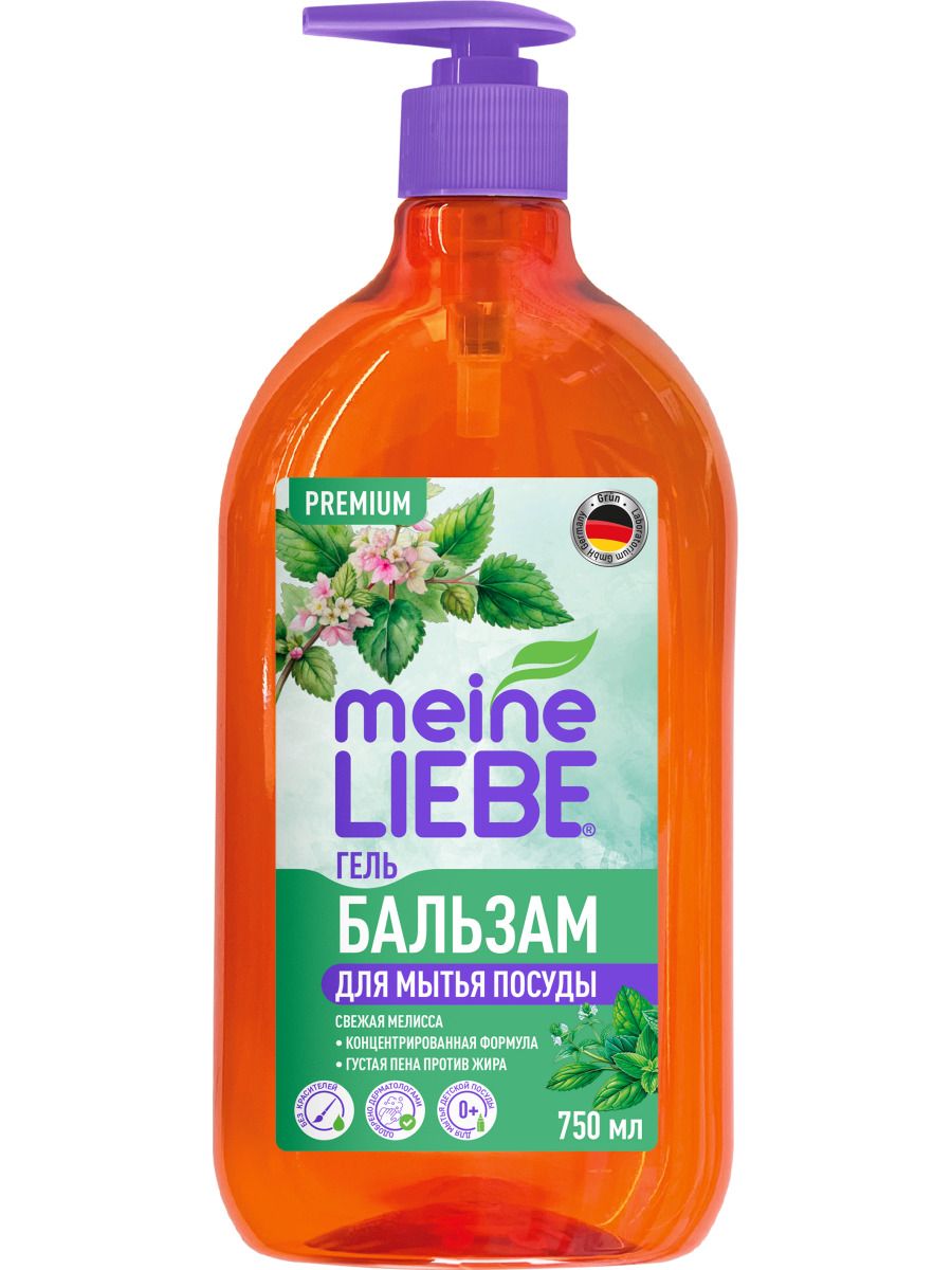 Meine Liebe гель бальзам для мытья посуды свежая мелисса концентрат 750 млБлагодаря густой пене и концентрированной формуле гель-бальзам Meine Liebe превосходно справляется с жиром даже в холодной воде. Удаляет остатки пищи, налет и неприятные запахи, легко смывается с посуды. Формула без красителей на основе растительных ПАВ подходит для мытья детской посуды и бутылочек.