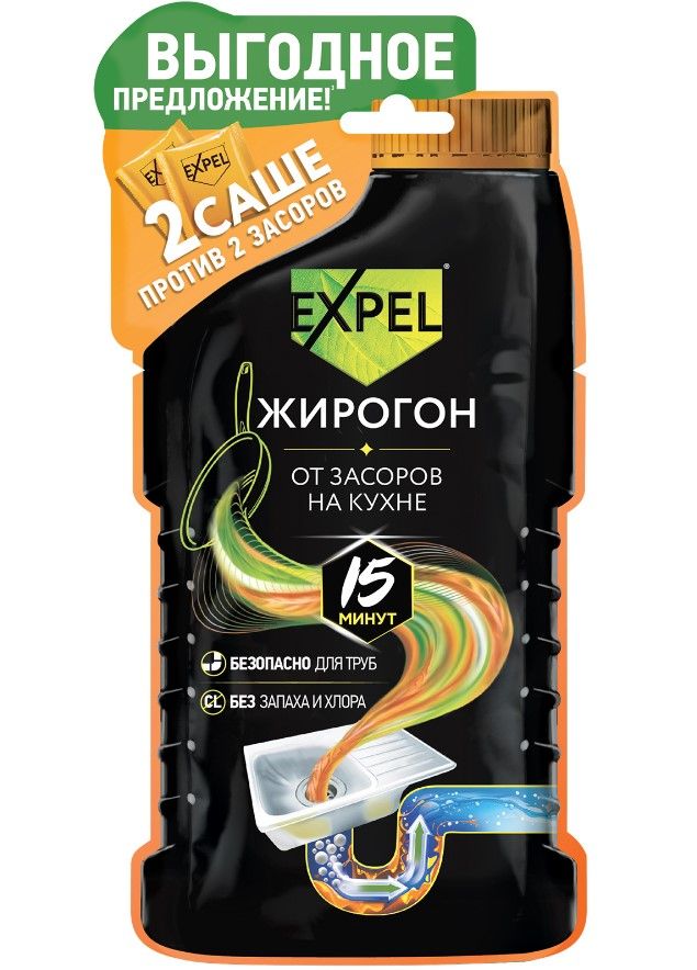 Expel жирогон средство для устранения засоров от жира и пищевых остатков 2 саше 50 гКаково это – чувствовать себя сантехником каждый раз, когда на кухне случается засор?С EXPEL вы никогда не узнаете об этом! Представляем вашему вниманию профессиональное средство от засоров – EXPEL ЖИРОГОН!Жир и остатки пищи – вот две основные причины возникновения засоров на кухне. Специализированная формула EXPEL разработана с учётом этих особенностей. Эффективный состав ЖИРОГОНА усилен гранулами алюминия, которые помогают растопить жир и удалить жировую пробку всего за 15 минут, не выделяя при этом вредного для здоровья хлора.Высыпаем – Заливаем – Ждём – Смываем. Всё максимально просто и удобно! А экономичный расход средства для прочистки труб EXPEL позволит вам надолго забыть о проблеме засоров на любимой кухне!С EXPEL все засоры уЛетучиваются!• Полностью устраняет жир и пищевые остатки за 15 минут!• Прост и удобен в использовании• Рассчитан на 2 применения: 2 саше=2 засора!• Безопасен для труб• Не содержит хлора• Без запаха