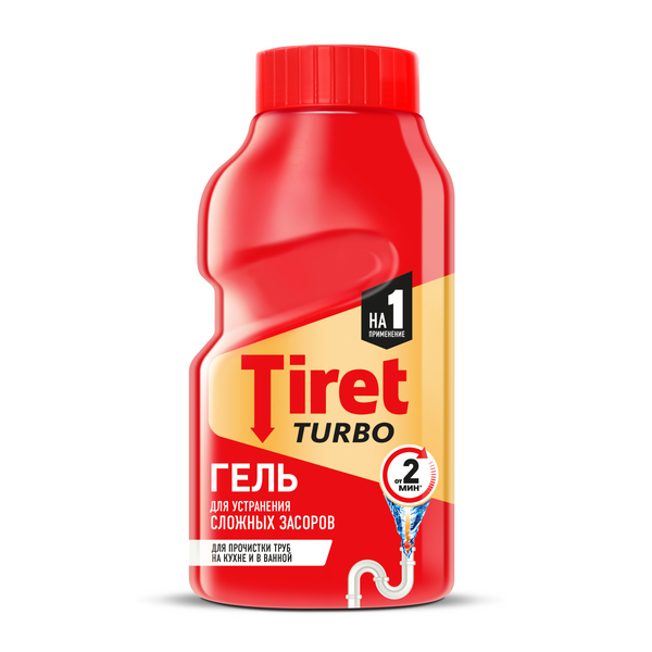 Мощный гель Tiret - устраняет засоры за 5 минут. Дезинфицирует.Устраняет засоры лучше, чем традиционные методы и средства. Благодаря густой структуре, гель лучше проникает в трубу, даже при наличии воды в раковине. Идеально подходит и безопасен для металлических и пластиковых труб *.