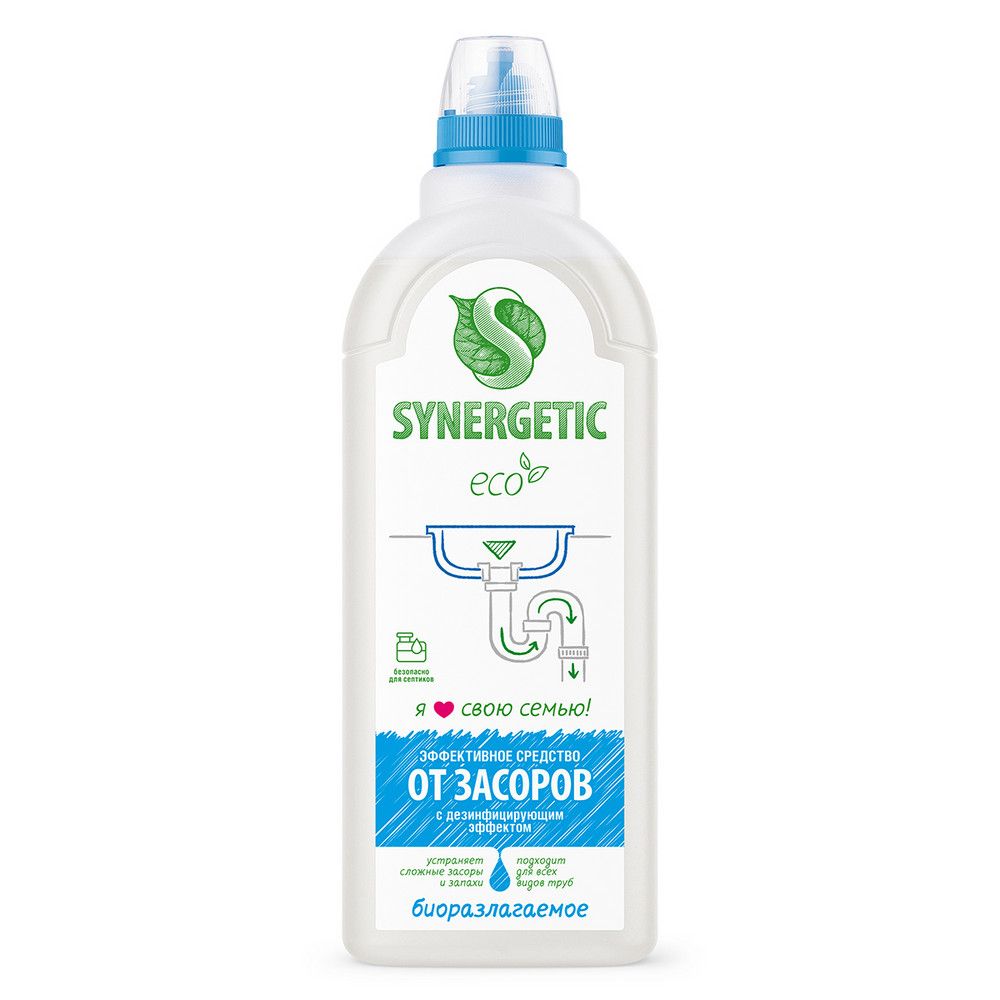 Synergetic средство для устранения засоров 1 лКонцентрированное средство для устранения засоров SYNERGETIC - высокоэффективное средство, подходящее для любых видов засоров и канализационных труб. Устраняет запахи и обладает дезинфицирующим эффектом, справляется с засорами даже в стоячей воде. Комплекс биоразлагаемых растительных А-тензидов и соды удаляет засоры всего за полчаса. Кальцинированная сода создает необходимую для растворения засора щелочную среду и быстро расщепляет масложировые компоненты. Биоразлагаемое средство не содержит хлора, ароматизаторов, красителей и агрессивных ПАВ, оно безопасно для всех видов труб и септических установок. Попадая в среду септика, средство «понятно» для микроорганизмов и без труда распадается на простые соединения.