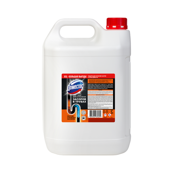 Доместос специальное чистящее средство для устранения засоров в трубах 5 лДоместос специальное чистящее средство для устранения засоров в трубах помогает устранить даже самые сложные засоры на кухне и в ванной всего за 7 минут’. Доместос гель для устранения засоров в трубах растворяет волосы, мыльный налет, остатки пищи (жировые, белковые, углеводные, овощные, фруктовые). Больше не нужно переживать, что средство закончится в самый неподходящий момент - покупайте знакомые продукты в упаковке 5 литров. Большой объем – большая выгода’’! Доместос для прочистки труб от засоров борется с неприятными запахами, бактериями и плесенью, которые сопровождают засоры. Доместос гель для устранения засоров в трубах безопасен для всех видов труб: металлических, металлопластиковых, чугунных или полимерных. Доместос специальное чистящее средство для устранения засоров в трубах: -помогает устранять даже самые сложные засоры в раковине, душевой кабине и ванной всего за 7 минут’; -смывает микробы и борется с неприятными запахами; -безопасен для всех видов труб; -упаковка продукта пригодна к переработке’’’; -имеет биоразлагаемую формулу; -в большой упаковке - до 2 раз меньше пластика*. Средство Доместос от засоров труб можно использовать на кухне, в ванной комнате или душе.
