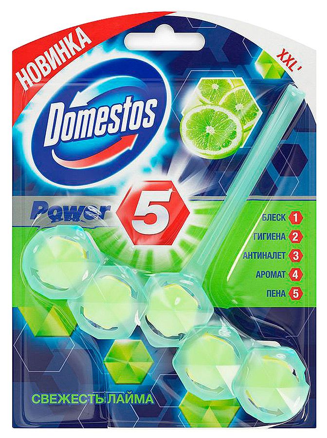Доместос сила 5 в1 блок для унитаза свежесть лайма защита от микробов и налета 55 грБлок для очищения туалета 5 Свежесть лайма защита от микробов, известкового налета и неприятного запаха — это пять преимуществ, помогающих обеспечить защиту от загрязнений и микробов и сохранить чистоту и блеск. При каждом смывании появляется свежий аромат лайма на срок до 4 часов и обильная пена, которая борется с налетом, поддерживая гигиену и блеск поверхности унитаза. Блок Доместос для унитаза содержит активное вещество, которое под действием напора воды ополаскивает всю поверхность унитаза, защищая от бактерий и помогая предотвращать известковый налет. Блок для туалета 5 Свежесть лайма: -защита от микробов до 400 смываний -предотвращает известковый налет; -борется с неприятными запахами; -удаляет грязь обильной пеной; -оставляет блеск и приятный аромат после смывания; -содержит 1 блок в упаковке; -работает до 1,5 раз дольше*.