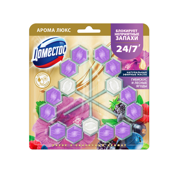 Доместос арома люкс трио арома блок для очищения унитаза сказочный аромат блокировка неприятного запаха 3 x 50 грDomestos Aroma Lux Trio — туалетный блок для унитаза с ароматом сочных лесных ягод и пряного гибискуса. Освежитель для унитаза борется с неприятными запахами, защищает от загрязнений и микробов, помогает поддерживать гигиену и опрятный вид ванной комнаты. Блок «Антиналет» для сантехники Domestos содержит активное вещество, которое под напором воды превращается в обильную пену и ополаскивает всю поверхность унитаза. Результат: блеск, чистота и длительная свежесть. Шарики для унитаза Domestos Aroma Lux Trio: Блокируют неприятные запахи 24/7'; Оставляют долгий аромат благодаря натуральным эфирным маслам'; Обеспечивают гигиену и защиту от микробов'; Предотвращают появление известкового налета'; Работают до 1,5 раза дольше''. Таблетки для унитаза представлены в выгодном формате — по 3 блока в упаковке. Чтобы вы каждый день наслаждались свежестью и забыли о ежедневной уборке сантехники.