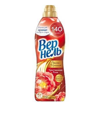 Вернель арома чувственная роза кондиционер для белья 0,87 лКонцентрированный кондиционер для белья Вернель Ароматерапия Чувственная роза подарит Вашему белью не только невероятную мягкость, но и чувственный яркий аромат дикого гибискуса с нотами роз, а благодаря специальным аромакапсулам в составе кондиционер для стирки Вернель позволит наслаждаться интенсивным ароматом белья до 140 дней.