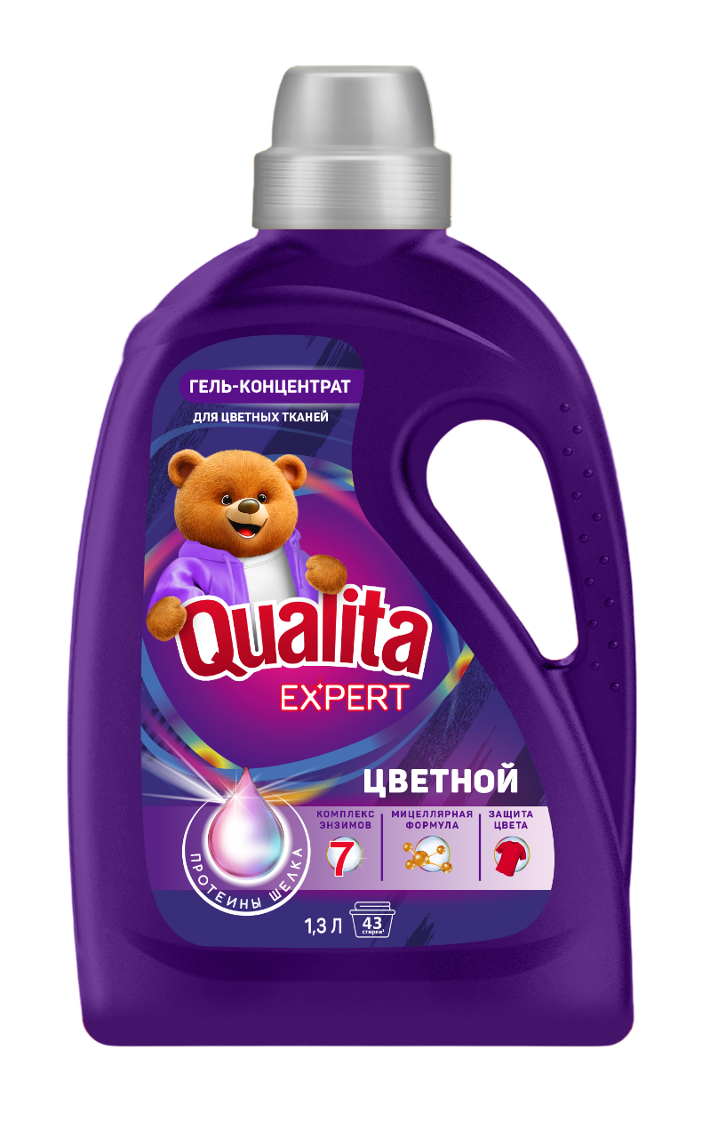Qualita Expert гель концентрат для стирки цветных тканей флакон 1300 млГель-концентрат для стирки ЦВЕТНОЙ «EXPERT QUALITA»: не только стирка, но и уход за одеждой за счет протеинов шелка. Новая мицеллярная формула эффективно удаляет сложные пятна благодаря комплексу 7 Энзимов, который борется с семью типами загрязнений. Сохраняет структуру ткани и глубину цвета. А во время стирки, ваши вещи получают дополнительный уход, за счет протеинов шелка. Они глубоко проникают в структуру волокон, придают блеск, повышают эластичность и упругость ткани, а также, протеины шелка создают эффект антистатика. Разработан специально для стирки цветного белья.