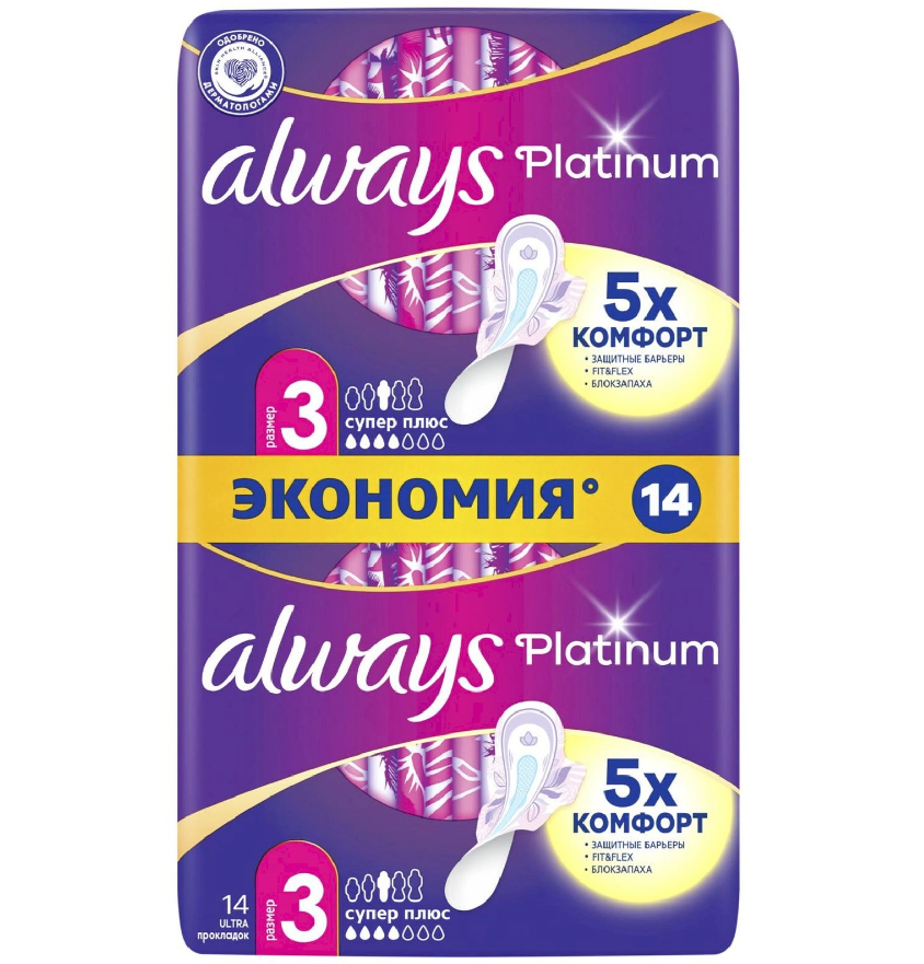 Always ультра platinum collection super plus duo 14 штГигиенические прокладки Always Platinum обеспечивают лучшее сочетание комфорта и защиты среди прокладок Always.
