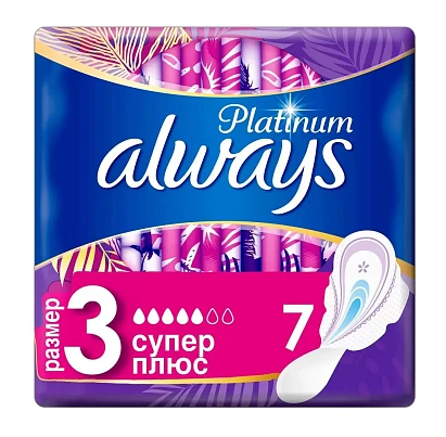 Always прокладки platinum collection super plus single гигиенические 7 штГигиенические прокладки Always Platinum обеспечивают лучшее сочетание комфорта и защиты среди прокладок Always. Always Platinum более комфортны (по сравнению с Always Ultra) благодаря тысячам микроподушечек и новым, мягким как шелк крылышкам. Они также обеспечивают лучшую защиту (по сравнению с Always Ultra) благодаря защитным боковым барьерам и ультравпитывающему внутреннему слою, который запирает влагу внутри.
