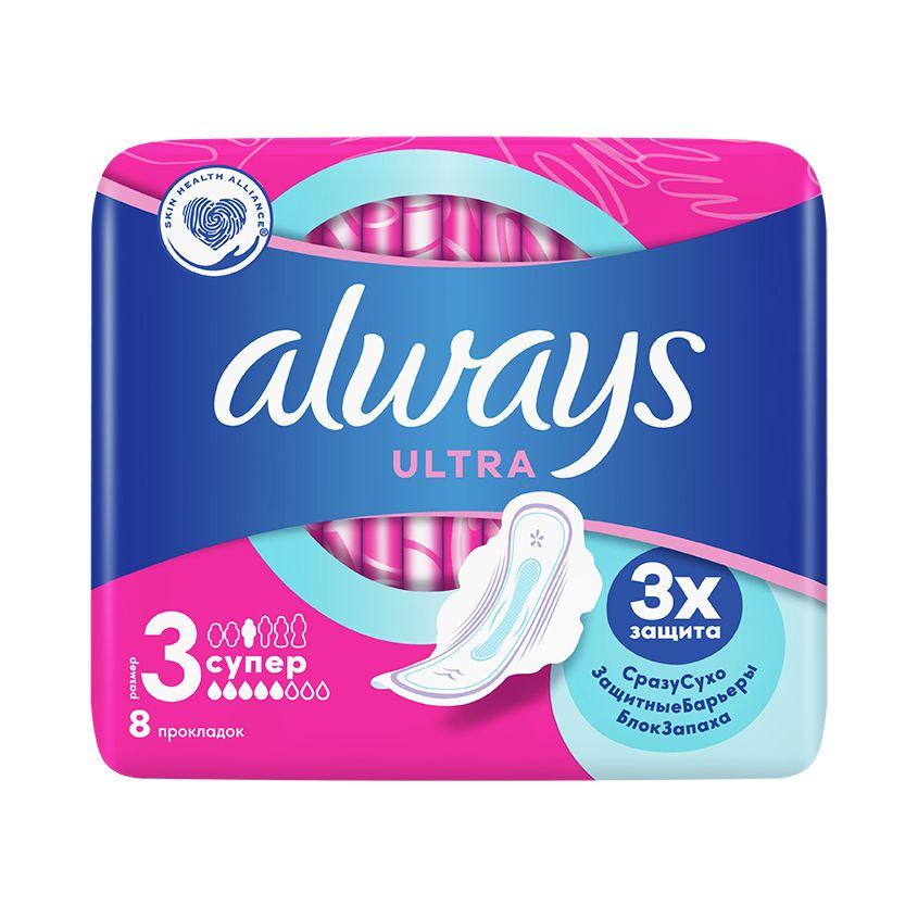 Always ультра супер 8 штТройная защита от Always — не соглашайтесь на меньшее: в Always Ultra «Супер» (Размер 3) с крылышками используется новейшая технология для создания многофункциональной гигиенической прокладки с 3 элементами защиты. Система «Сразу сухо» впитывает влагу за считаные секунды и не дает ей соприкасаться с кожей. Технология «Защитные барьеры» удерживает жидкость, предотвращая протекания. Технология «Блок запаха» нейтрализует неприятные запахи, придавая ощущение свежести и чистоты во время менструации. С Always Ultra вы можете чувствовать себя уверенно весь день. Тройная защита от Always — не соглашайтесь на меньшее. Формула дерматологически одобрена Ассоциацией здоровья кожи (Skin Health Alliance). Попробуйте Always Ultra Secure Night Extra с крылышками — лучшие гигиенические прокладки Always для защиты в ночное время. Обеспечьте себе наилучшую защиту с помощью Always My Fit — специальной системы определения размера, которая помогает правильно подобрать прокладку ALWAYS на основании количества выделений и размера трусиков. Супервпитывающий внутренний слой с системой «Сразу сухо», которая впитывает жидкость за считаные секунды. Технология «Защитные барьеры» удерживает жидкость, предотвращая протекания. Технология «Блок запаха» нейтрализует неприятные запахи. Гигиенические прокладки не раздражают кожу (доказано дерматологами). Крылышки помогают удерживать прокладку на месте для надежной защиты и ощущения комфорта.