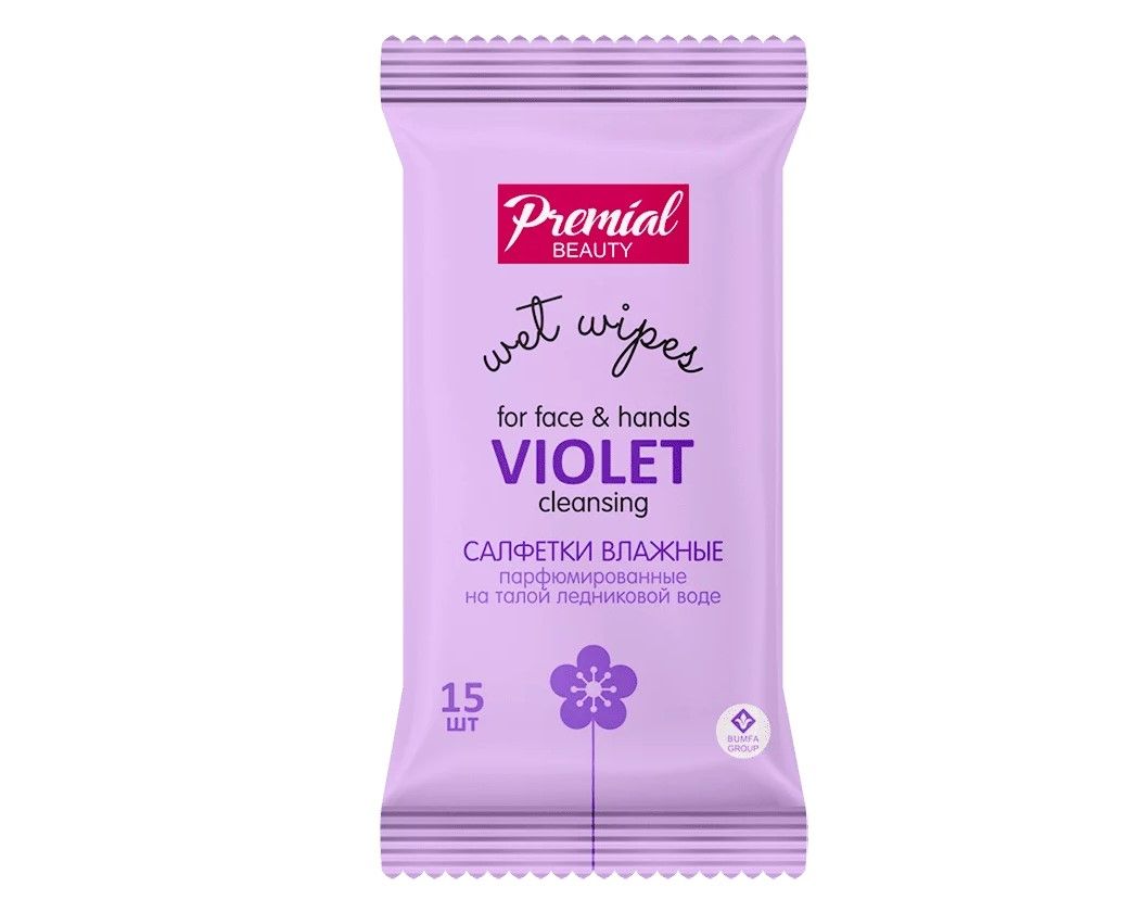 Premial салфетки влажные очищающие фиалка 15 штPREMIAL La fleur влажные салфетки с ароматом фиалки предназначены для гигиены рук и лица. Салфетки деликатно очищают и одновременно ухаживают за нежной кожей. В состав лосьона входит витамин Е, который оказывает дополнительное увлажнение и питание кожи