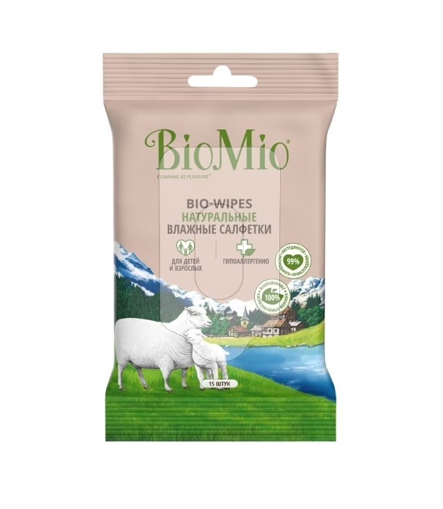 BioMio влажные салфетки натуральные с экстрактом хлопка для детей и взрослых Bio-Wipes 15шт