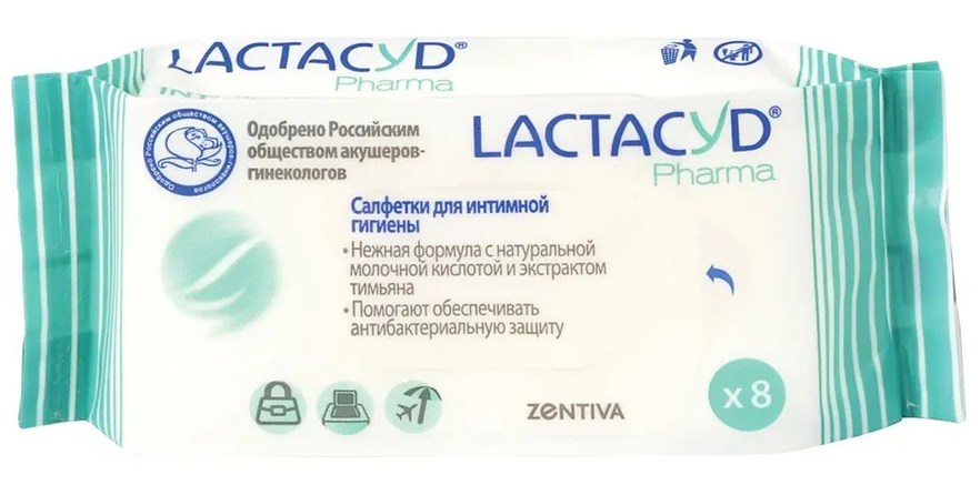 ЛАКТАЦИД фарма салфетки с экстрактом тимьяна салфетки для интимной гигиены упаковка № 8Влажные салфетки LACTACYD - ваш верный и надежный спутник в любой ситуации и любом месте. Благодаря ткани из натурального растительного волокна, они нежно и бережно очищают. Натуральная молочная кислота поддерживает естественную микрофлору интимной зоны. Экстракт Тимьяна обеспечивает антибактеральное действие