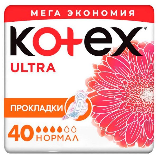 Kotex ultra нормал гигиенические прокладки 40 штЛинейка гигиенических прокладок Kotex Ultra Нормал создана для защиты при умеренных выделениях. Стремясь обеспечить девушкам полный комфорт, мы разработали и выпустили женские дневные прокладки Котекс с 3центром. Эта технология позволяет изделию быстро собирать и впитывать влагу — таким образом, она не растекается к краям, и протекания полностью исключены. Такой подход делает прокладки Котекс идеальными и для девушек, приверженных к динамичному ритму, и для бизнес-леди, которым нужно быть уверенными в себе на важных переговорах, и для домохозяек. У прокладок для месячных с крылышками новая яркая упаковка с алой герберой. В пачке 40 штук Kotex 4 капли — удобно носить в дамской сумочке.