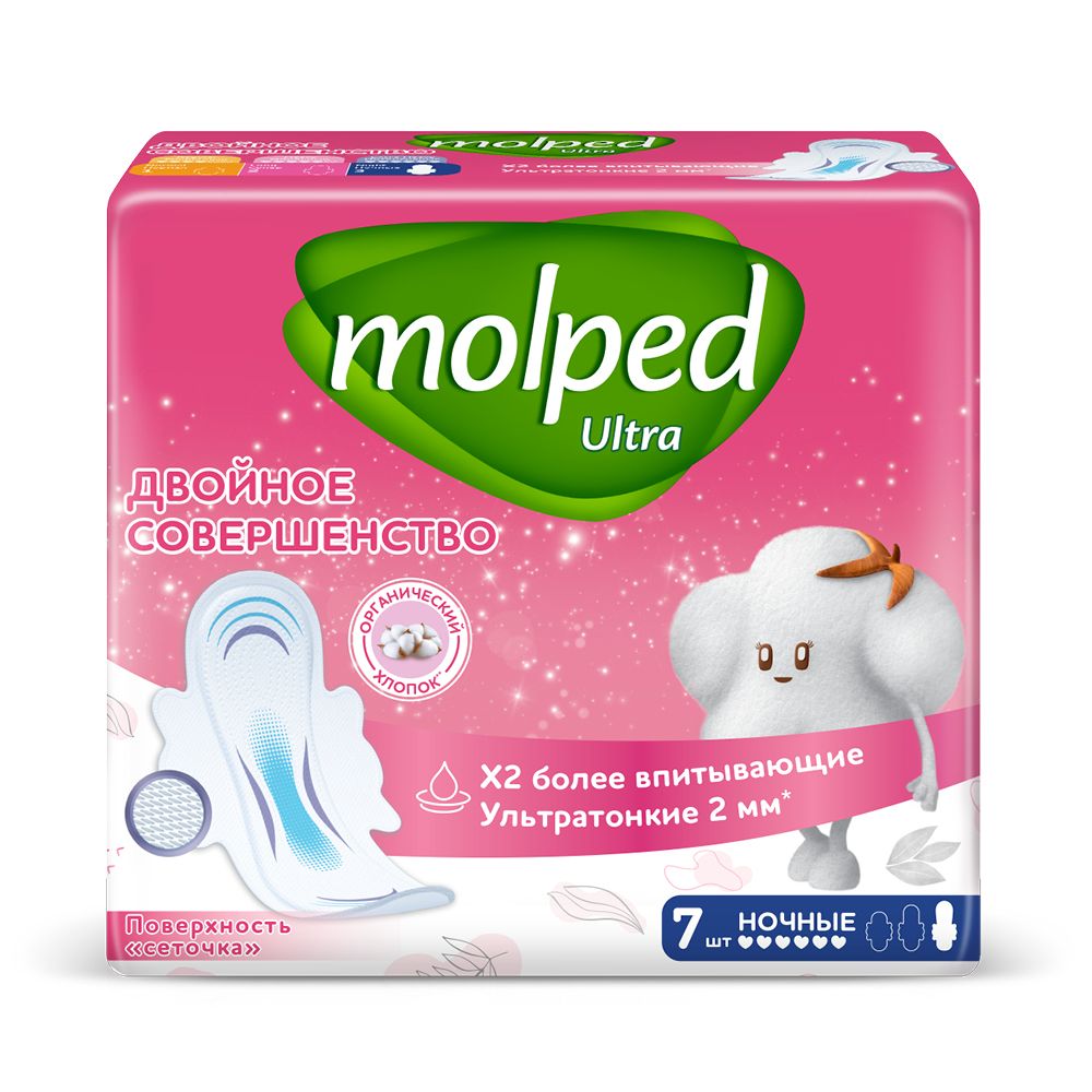 Molped ультратонкие прокладки с крылышками ночные 7 штГигиенические женские прокладки оснащены технологией нейтрализации запаха, которая блокирует неприятный запах, а не просто маскирует его. Ультратонкие и максимально впитывающие. Задняя часть прокладок более широкая.