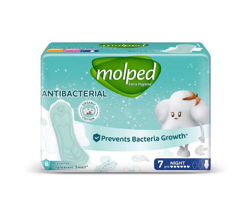 Molped антибактериальные прокладки c крылышками ночные 7 штПрокладки Molped Extra Hygiene c мягкой поверхностью и добавлением органического хлопка помогают предотвратить неприятный запах, вызываемый бактериями. Специальный антибактериальный слой блокирует рост бактерий на поверхности прокладки. Molped Extra Hygiene протестированы дерматологами* и обеспечат максимальный комфорт твоей коже.