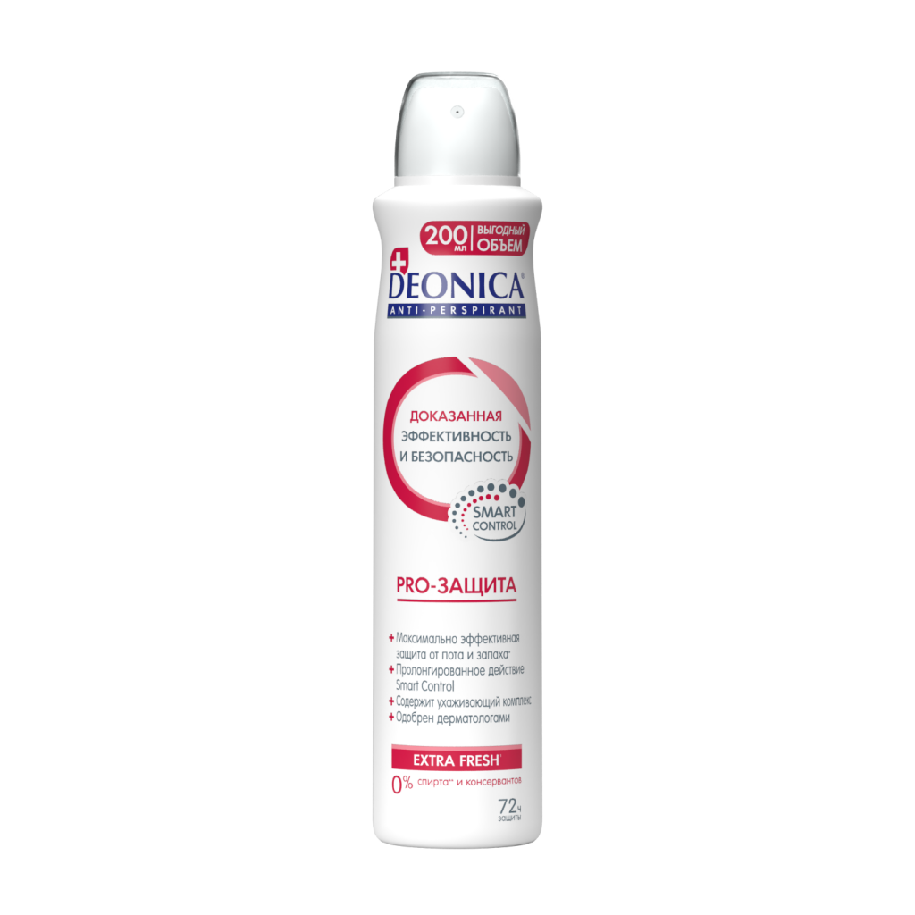 Deonica спрей женский pro защита 200 млСовременный антиперспирант DEONICA PRO-ЗАЩИТА содержит комплекс антибактериальных, противомикробных и противовоспалительных компонентов и обеспечивает максимальную защиту* от пота и запаха в течение 72 часов.