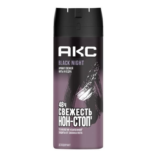 Акс дезодорант парфюмированный мужской спрей black night защита от запаха пота 48 часов 150 млПссс, бро… Взгляни, что у нас есть: идеально свежий и безукоризненно стильный аромат для мужчин AXE Black Night. Нам не важно, кто ты: тусовщик или денди, гуманитарий или технарь, за альянс или за орду. AXE обеспечит тебе уверенность в своем образе — и в своих силах! Дезодорант спрей AXE Black Night создан в сотрудничестве с лучшими мировыми парфюмерными командами. Впрочем, его суперспособность — это не только топовый аромат* с настоящим мужским характером, но и целых 48 часов защиты против запаха пота для тебя**. За счет цинка в составе AXE защитит твою кожу от бактерий, вызывающих неприятный запах при потоотделении. Его антибактериальный эффект — секрет твоего спокойствия! Формат аэрозоля идеален для мягкой ежедневной защиты. Для лучшего результата наноси его на чистую, сухую кожу. Например, сразу после душа. Это будет классное начало дня! Ну, или ночи…
