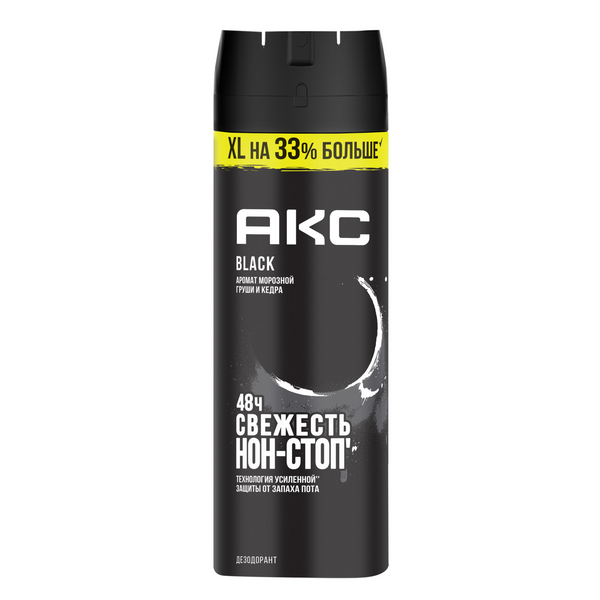 Акс дезодорант парфюмированный мужской спрей black защита от запаха пота 48 часов 200 млОсвежающий мужской дезодорант Акс BLACK создан специально для крутых парней, которым нужна полная уверенность в своем образе и безукоризненно стильный парфюм. Аэрозольный мужской дезодорант спрей из смелой линейки создан для тех, кто не боится стоять на своем, готов следовать за мечтой и привык действовать! Дезодорант Акс мужской не оставляет следов и пятен на одежде. Дезодорант парфюмированный Акс BLACK обеспечивает желанную свежесть коже подмышек. Эффективная формула спрея Акс 2в1 включает в себя два основных элемента защиты. Это надежная защита от запаха пота на 48 часов* и топовый** аромат. Парфюмерная композиция средства раскрывается сочными нотами спелой груши, освежающего арбуза и пряного бергамота. В сердце аромата царят цветочные нотки водной лилии и фрезии, а шлейф парфюма составлен из древесных акцентов. Морозная груша и кедр — это утонченный и благородный запах, который станет изысканным дополнением к твоей коллекции парфюмированных средств для личной гигиены. Состав продукта обогащен ультрасильной'' антибактериальной технологией против запаха пота, в составе которой один из самых сильных консервантов, синтезируемый из различных зерновых культур. Она оказывает антибактериальный эффект, защищая от бактерий, вызывающих неприятный запах при потливости. Парфюмированный дезодорант Акс не блокирует потовые железы.
