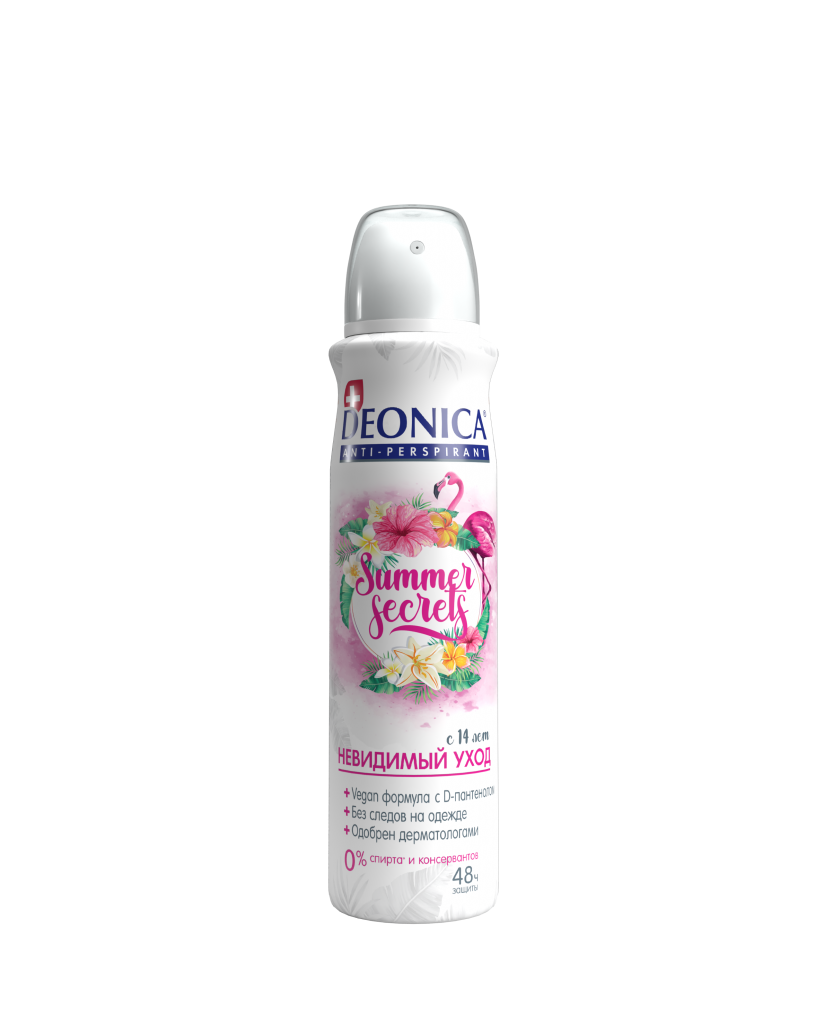 Deonica антиперспирант summer secrets 150 мл спрейЭкзотический фруктово-цветочный аромат открывающийся нотами франжипани, взбитых сливок и зефирок маршмэллоу.Не оставляет следов на одежде.Содержит D-Пантенол.Подходит для использования с 14 лет.