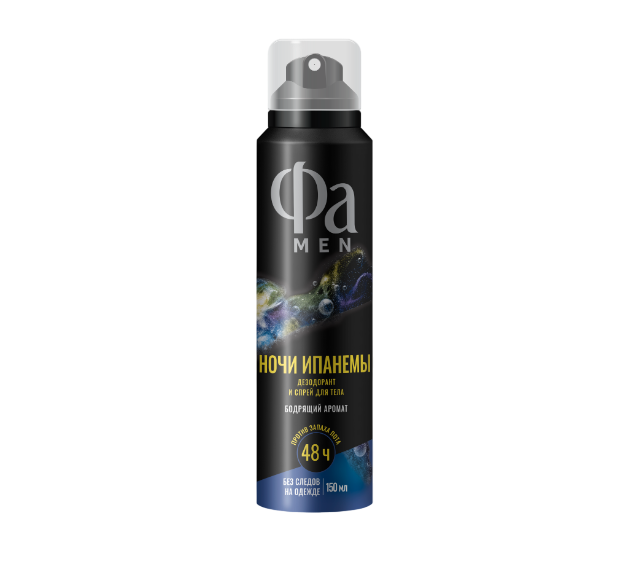Фа men део спрей ночь ипанемы 150 млПочувствуй пульсацию бразильских ночей с бодрящим ароматом тропических фруктов и 100% натуральным экстрактом гуараны. Зарядись энергией бразильских ритмов!