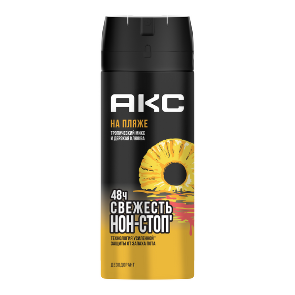 Акс дезодорант мужской парфюмированный спрей на пляже 48 ч защита от пота и запаха 150 млДезодорант мужской спрей АКС НА ПЛЯЖЕ - это эффектная уходовая новинка, созданная для крутых парней, благодаря чему нужна полная уверенность в его образе. Парфюмированный дезодорант мужской обеспечивает надежную защиту от запаха пота на протяжении 48 часов. Дезодорант для мужчин спрей содержит активный компонент против порчи. Акс дезодорант мужской с топовым* ароматом, разработанным на основе ультрасильной антибактериальной технологии против запаха аэрозоля. Дезодорант Акс мужской НА ПЛЯЖЕ обеспечивает желанную свежесть нон-стоп и эффективный уход за кожей подмышек. Дезик мужской спрей знаменателен незабываемым фруктовым ароматом, на создание которого нас вдохновили известные хит-барные меню 1980-х - популярный алкогольный коктейль ''Секс на пляже''. Основа запаха НА ПЛЯЖЕ - это ТРОПИЧЕСКИЙ МИКС И ДЕРЗКАЯ КЛЮЧА. Невероятно притягивающие ноты клюквы, такого ананаса и яркого апельсина передали новый аромату Акс свой страстный головокружительный характер.