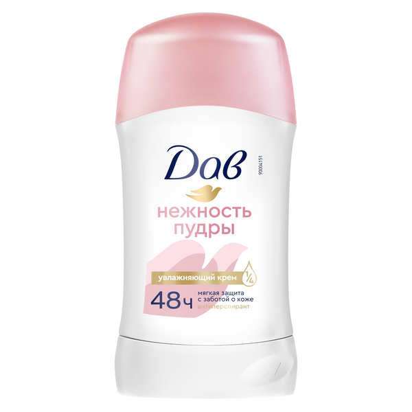Дав дезодорант стик нежность пудры 40 млЗащита от пота на 48 часов -Не содержит этилового спирта -На ¼ состоит из увлажняющего крема -Подходит для ежедневного применения -Нежный аромат и удобное применение Dove антиперспирант-дезодорант стик Нежность пудры с уникальной* формулой без этилового спирта с нежным ароматом детской присыпки обеспечивает гладкость и шелковистость кожи в подмышках. Дезодорант-антиперспирант карандаш Dove эффективно защищает от пота, неприятного запаха и других последствий эмоциональной и физической активности в течение 48 часов. Натуральные ингредиенты, отсутствие спирта и ¼ увлажняющего крема в составе в течение 3 дней** избавляют от раздражения после бритья, обеспечивая комфорт и уверенность в себе. Масло семян подсолнечника с витаминами E и F оказывает антиоксидантное воздействие и эффективно справляется со свободными радикалами, участвующими в процессе старения клеток эпидермиса. Женский дезодорант-антиперспирант Dove Нежность пудры обеспечивает защиту от пота на 48 часов и подходит для женщин с любым типом кожи, а также для подростков от 14 лет.