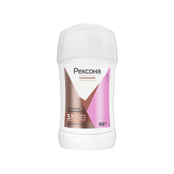 Рексона клиникал део стик сухость и уверенность 40 млЧтобы регулировать повышенное потоотделение и помогать вам оставаться сухим и свежим даже при стрессе, Rexona разработала революционную технологию совершенной защиты Defence+, которая образует микропленку на поверхности кожи, обеспечивая 96 часов непрерывной защиты от пота и запаха. Защита в 3 раза эффективнее базового антиперспиранта. Максимальная защита даже в экстремальных ситуациях (стресс, жара, спорт). Сухость надолго! Антиперспирант - стик женский равномерно и быстро наносится без эффекта влажной или липкой пленки. Создается приятное ощущение мягкой сухости после нанесения. Удобно брать с собой! Бодрящая смесь свежих фруктов и сочного яблока немедленно взбодрит вас на старте дня. В сердце аромата – удивительная гармония успокаивающих нот жасмина и розы, плавно переходящая в теплую древесно-мускусную основу композиции. Clinical protection/ Defence+ (клиникал протекшн/Дефенс+) - защита от повышенного потоотделения.