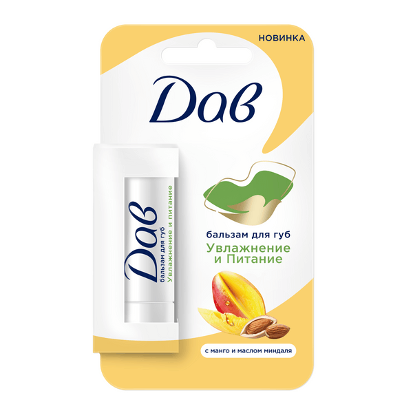 Дав бальзам для губ увлажнение и питание увлажняющий и питательный 4 грБальзам для губ Дав Увлажнение и питание с экстрактом манго и маслом миндаля создан для бережного ухода за сухой кожей губ. Косметический бьюти продукт подходит для женщин, девушек и девочек-подростков с 14 лет, ценящих нежный уход и заботу о своих губах. Увлажнение и питание кожи губ обеспечиваются формулой бальзама, содержащей натуральные масла миндаля и ши, эмоленты и активные компоненты, которые удерживают влагу в коже. А также обеспечивают восстановление кожного покрова, отсутствие чувства стянутости и сухости. Витамин Е, входящий в состав, смягчает и увлажняет кожу. Защитная уходовая формула гигиенички обеспечивает дополнительную защиту от негативных внешних факторов. Гигиеническая помада для губ увлажняющая женская обладает легкой текстурой, которая словно тает на губах, окутывая их ощущением комфорта и заботы. Насладитесь сладким ароматом сочного манго, который превратит каждое нанесение в неповторимый ритуал ухода и подарит удовольствие от использования!
