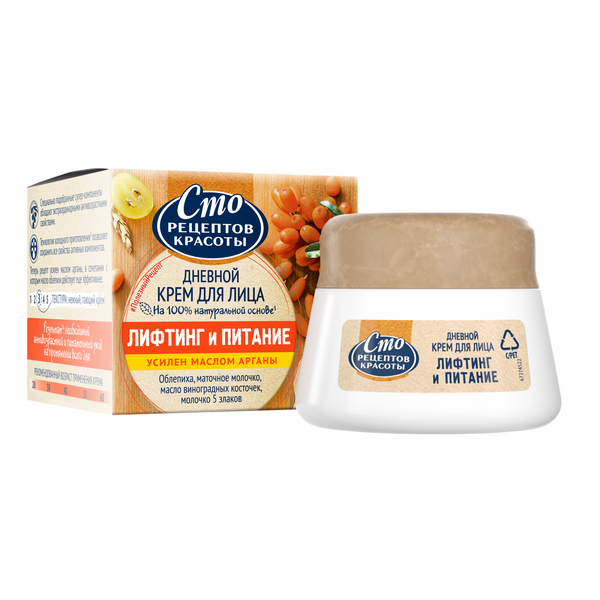 100 Рецептов Красоты крем дневной для лица лифтинг и питание 50 млВстречай каждое утро с полезным дневным кремом Сто Рецептов Красоты! Дневной крем для лица Лифтинг и питание с маслом облепихи и первоцветом обеспечивает необходимый уход за возрастной кожей и полноценное питание на целый день! Облепиха - важный компонент для антивозрастного ухода, восстановления и защиты кожи от сухости, благодаря содержанию рекордного количества полезных веществ (более 100!). Масло облепихи улучшает обмен веществ и микроциркуляцию в подкожно-жировой клетчатке, способствуя питанию, смягчению кожи, предохраняет кожу от высыхания и шелушения; восстанавливает липидный и кислотно-щелочной баланс кожи, способствует повышению упругости и эластичности кожи, устранению возрастных и мимических морщин за счет стимуляции синтеза коллагена), предотвращает преждевременное старение кожи. Так же способствует отбеливанию кожи, осветлению веснушек и других пигментных пятен, восстанавливает кожу, поврежденную вследствие солнечных или химических ожогов, предупреждает воспаление кожи и способствует устранению угревой сыпи. Пчелиное маточное молочко считается супер-продуктом из-за феноменально высокого содержания биологически активных веществ, омолаживающих кожу. Масло Виноградных косточек и молочко 5 злаков питают и смягчают кожу, поддерживая ее естественную красоту. Помимо этого, масло виноградных косточек успокаивает, питает, смягчает, увлажняет, тонизирует кожу, делает ее более упругой, укрепляет стенки кожных сосудов, улучшает цвет лица, противостоит разрушению волокон коллагена и эластина, защищает от вредного солнечного излучения. Благодаря высокому содержанию особых биофлавоноидов, напоминающих структуру человеческого эстрогена (которых называют фитоэстрогенами) масло восстанавливает поврежденные мембраны клеток, так же оказывает антиоксидантное, регенерирующее и, соответственно, выраженное антивозрастное действие. Кроме этого, масло обеспечивает регулирует деятельность сальных желез. Все продукты бренда Сто Рецептов Красоты готовятся на 100% натуральной основе, компоненты которой отмечены в составе, по Технологии Холодного Приготовления (особая холодная стадия добавления активных компонентов), которая позволяет сохранить всю пользу полезных компонентов рецепта.