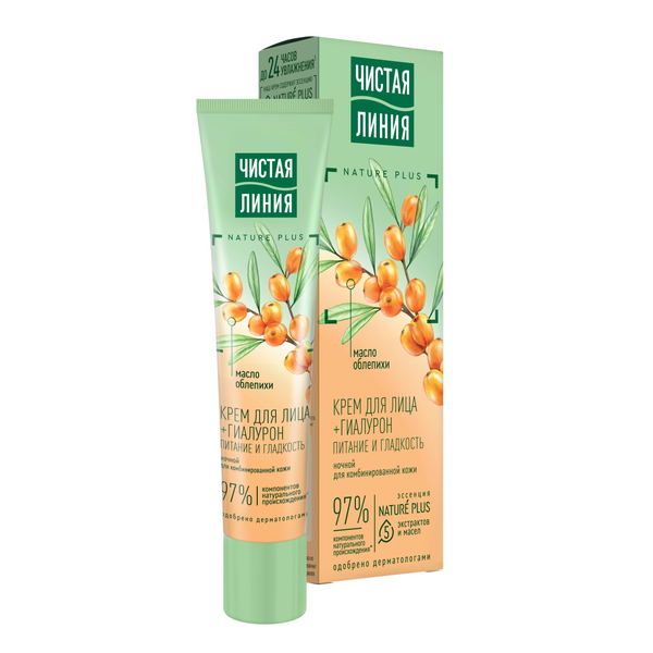 Чистая Линия ночной крем для лица питание и гладкость с гиалуроном и маслом облепихи 40 млВстречайте обновленный крем от Чистой Линии с усиленной формулой1 и новым дизайном! Для полноценного ночного восстановления воспользуйтесь специальным кремом, отвечающим потребностям кожи именно вашего типа. Питательный ночной крем от экспертов бренда Чистая Линия содержит 97% компонентов натурального происхождения*. Активные ингредиенты крема: эссенция из пяти экстрактов и масел NATURE PLUS (экстракт вербены, экстракт пиона, масла миндаля, льна, оливы), масло облепихи и гиалурон питают, восстанавливают липидный барьер, предотвращая появление мелких морщинок. Кожа лица получает глубокое2 увлажнение, которое длится 24 часа3! - Экстракт вербены восстанавливает баланс увлажненности и тонизирует. - Экстракт пиона и льняное масло успокаивают и смягчают. - Масло миндаля содержит жирные кислоты, витамины Е и F, питает и выравнивает поверхность кожи. - Ферментированное оливковое масло богато природными антиоксидантами, питает и помогает предотвратить преждевременное старение кожи. - Гиалурон притягивает молекулы воды, а также создает на поверхности тонкую невидимую пленку, благодаря чему удерживает влагу в коже. - Масло облепихи восстанавливает кожу и насыщает ее витаминами K, E, C, B1, B2, B3, B6, B9, макро- и микроэлементами.