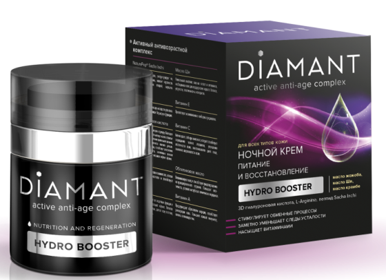 DIAMANT крем ночной питание и восстановление 50 млНочное время - это идеальный период для отдыха и восстановления кожи. Мышцы лица расслабляются, клеточный обмен становится интенсивнее, кожа более восприимчива к активным компонентам, содержащимся в креме. Именно потому в это время происходит глубокая коррекция возрастных признаков. Многофункциональный крем DIAMANT разработан специально для ночного ухода. Он содержит антивозрастной комплекс, который стимулирует обменные процессы, снимает усталость и напряжение кожи, накопленные в течение дня. Он содержит 10 активных компонентов, которые способствуют интенсивному питанию и омоложению кожи, улучшают ее эластичность, увеличивают плотность дермы и повышают упругость. Нежная бархатистая текстура крема быстро впитывается и не оставляет жирной или липкой пленки на лице. Активный антивозрастной комплекс: