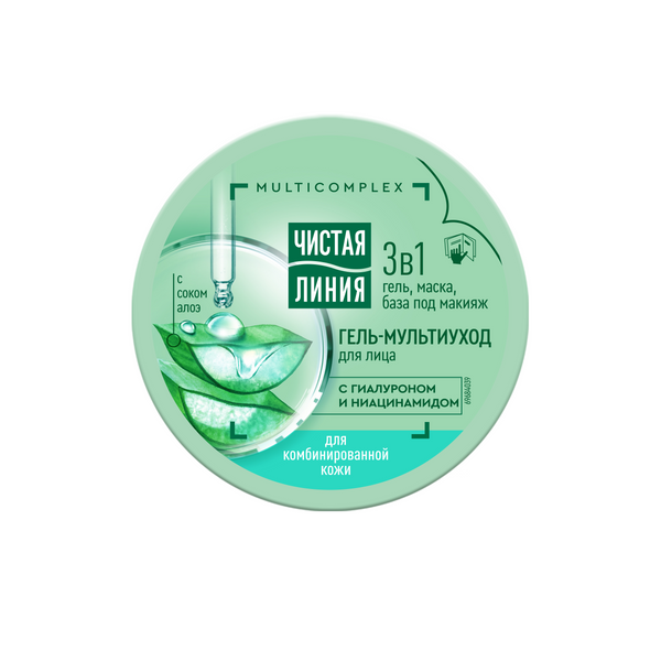 Чистая Линия гель мультиуход для лица для комбинированной кожи с соком алоэ гиалуроном и нициамидом 100 млПопробуйте гель-мультиуход Чистая Линия, разработанный специально для комбинированной кожи. Продукт имеет легкую, приятную освежающую консистенцию, которая быстро впитывается, при этом увлажняет кожу. В составе продукта 97% компонентов натурального происхождения*. Так, сок алоэ увлажняет и успокаивает. Гиалурон создает на поверхности кожи тонкую невидимую пленку, тем самым препятствуя потере влаги, смягчает и увлажняет кожу. Ниацинамид восстанавливает барьерную функцию кожи, улучшает рельеф и внешний вид. Результат: кожа увлажнена и восстановлена без жирного блеска. Гель-мультиуход может быть использован как крем, маска и база под макияж. Большого объема 100 мл по выгодной цене' хватит надолго, и он будет всегда под рукой. Одобрен дерматологами. Для наилучшего результата очищайте кожу утром и вечером гелем для умывания 3 в 1, тонизируйте и наносите кремы для лица и вокруг глаз, 2-3 раза в неделю используйте гель-мультиуход как маску. Продукты Чистая Линия не тестируются на животных, что подтверждено лицензией международной организации.