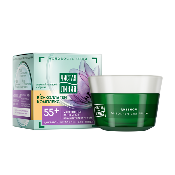 Чистая Линия дневной фито крем для лица от 55 лет шлемник и морошка 45 млС возрастом кожа быстрее теряет влагу, становится менее подтянутой и эластичной, ее защитные функции ослабевают. Именно потому зрелая кожа нуждается в особом уходе, и эксперты Чистой линии создали линейку фито-кремов от 55 лет. Средства линейки наполняют кожу сиянием и оказывают заметный лифтинг-эффект. В состав линейки входят активные натуральные компоненты, созданные самой природой: вытяжка шлемника байкальского, масло морошки и комплекс фитопротеинов. Кремы Чистая Линия обогащены комплексом BIO-коллаген из ростков и семян пшеницы. Уже с первого применения проникая в кожу, комплекс BIO-коллаген наполняет и разглаживает ее. Уже через 16 дней восстанавливает контуры лица Дневной фито-крем Шлемник и морошка из линейки средств Фито-линия от 55 лет освежает цвет лица, наполняет кожу здоровьем и сиянием. Активные натуральные компоненты BIO-коллаген комплекса в составе крема восстанавливают контуры лица уже за 16 дней, разглаживают кожу, делают ее более упругой. Результат: Мгновенно: подтягивает кожу и интенсивно питает, заметный лифтинг-эффект уже через 16 дней, контуры лица более чёткие, кожа более гладкая и упругая.