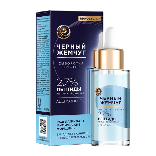 Черный Жемчуг сыворотка бустер для лица разглаживающая для всех типов кожи 30 млИнновационная*разглаживающая сыворотка-бустер разработана экспертами бренда Черный Жемчуг совместно с косметик-эстетистами для ежедневного комплексного ухода за кожей лица. Средство подходит для женщин и мужчин с разными типами кожи, включая чувствительную. Преимущества: • Заметно разглаживает мимические морщины; • Предотвращает возникновение новых заломов; • Повышает тургор и плотность кожи, оказывая лифтинг-эффект; • Способствует защите кожи от негативного воздействия синего света экранов'; • Защищает от окислительного стресса и улучшает метаболизм клеток кожи; • Замедляет процессы старения; • Мгновенно впитывается без ощущения липкости. Активные действующие компоненты: Пептиды ампул-концентрат в высокой концентрации 2,7% эффективно восстанавливает упругость кожи; Аденозин оказывает антиоксидантное воздействие. Почувствуйте усиленный эффект при использовании программы ухода: 1. Выравнивающая пилинг-скатка для лица. 2. Крем-эксперт для век. 3. Крем для лица 25+ SPF 30. Свойства разглаживающей сыворотки-бустера подтверждены в ходе потребительского тестирования**. Так, 94% респондентов отметили, что сыворотка заметно повышает плотность, придает ровный тон и сияние, визуально делает кожу более подтянутой; 90% – заметно выравнивает рельеф кожи; 88% – разглаживает мимические морщины; 91% – визуально подтягивает контур лица; 98% – освежает кожу.