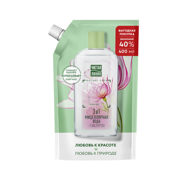 Чистая Линия мицеллярная вода 3в1 для всех типов кожи с экстрактом розы и гиалуроном успокаивает 400 млПопробуйте уход и очищение с Мицеллярной водой 3 в 1, которая теперь представлена в формате упаковки дойпак. Он позволяет сэкономить 40% при покупке'. Эксперты бренда Чистая Линия разработали средство для снятия макияжа, в составе которого 97% компонентов натурального происхождения*, в том числе эссенция из пяти экстрактов и масел NATURE PLUS – НЕЙЧЕ ПЛЮС (экстракт вербены, экстракт пиона, масла миндаля, льна, оливы), экстракт лепестков розы и гиалурон. Благодаря тщательно подобранному составу, мицеллярная вода эффективно снимает макияж, успокаивает и смягчает. Активные натуральные компоненты питают, восстанавливают липидный барьер, предотвращая появление мелких морщинок: • Экстракт вербены восстанавливает баланс увлажненности и тонизирует. • Экстракт пиона и льняное масло успокаивают и смягчают. • Масло миндаля, насыщенное жирными кислотами, витаминами Е и F, питает и выравнивает поверхность кожи. • Ферментированное масло оливы питает и защищает от преждевременного старения. • Гиалурон притягивает молекулы воды, а также создает на поверхности лица тонкую невидимую вуаль, благодаря чему препятствует чрезмерной потере влаги. • Экстракт лепестков розы успокаивает, освежает, придает гладкость и здоровое сияние.