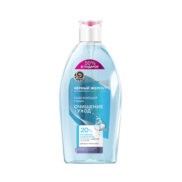 Черный Жемчуг тоник для всех типов кожи освежающий с коллагеном гиалуроном и маслом семян камелии 750 млЧистая и ухоженная кожа начинается с бережного и качественного очищения. Попробуйте тоник для всех типов кожи от бренда Черный Жемчуг, соответствующий новому* стандарту очищения: Очищение + Уход. Тоник освежает и тонизирует кожу, а также придает матовость на 24 часа2. Уход за кожей становится в 2 раза эффективнее1. Уникальная* технология: формула с 20% активной сыворотки увлажняет, питает и повышает упругость кожи уже на этапе ее очищения. В составе сыворотки коллаген, гиалурон, масло камелии. • Коллаген подтягивает кожу и восстанавливает тонус. • Гиалуроновая кислота активно увлажняет и, как следствие, улучшает внешний вид кожи, возвращает ей тонус и естественное сияние. • Камелия японская (масло цубаки) обладает антиоксидантными и успокаивающими свойствами. Эффективность подтверждена результатами тестирования2: 93% – кожа чистая, дышит свежестью; 87% – матовость без сухости на 24 часа. Одобрено дерматологами. Для максимального эффекта используйте все средства серии. Утром – гель для бережного и качественного очищения, затем ухаживающий тоник, который удалит остатки загрязнений и подготовит кожу к нанесению крема. Вечером откройте для себя мицеллярную воду, которая удалит даже стойкий макияж, при этом не оставляя чувства стянутости и сухости