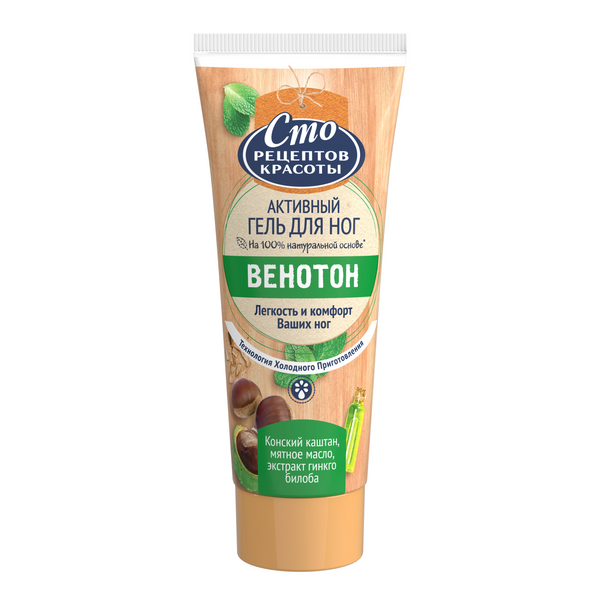 Сто Рецептов Красоты гель для ног венотон для снятия усталости 70 млРабота на ногах, узкая одежда, ношение каблуков, повышенная температура воздуха – все это способствует отечности и усталости ног. Попробуйте активный гель для ног Венотон от бренда СТО РЕЦЕПТОВ КРАСОТЫ, и ваши ножки вновь ощутят комфорт и легкость. Специально подобранные компоненты обладают активным действием для достижения выраженного результата. Технология холодного приготовления позволяет сохранить все полезные свойства активных компонентов геля. • Конский каштан способствует укреплению стенок кровеносных сосудов, улучшает обменные процессы в клетках кожи, тонизирует и снимает отечность. Обладает эффектом снятия чувства усталости, тяжести и напряжения. • Мятное масло тонизирует и восстанавливает, способствует охлаждению и приданию чувства легкости в ногах после применения. • Экстракт гинкго билоба успокаивает и тонизирует кожу, улучшает питание клеток и уменьшает отечность. Результат: легкость и комфорт ваших ног! Продукт выпускается в тубе объемом 70 мл, его удобно брать с собой и пользоваться дома по мере необходимости. Нанесите Венотон на стопы и голени (снизу вверх) массирующими движениями до полного впитывания.