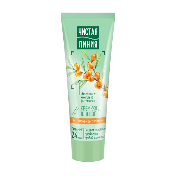 Чистая Линия крем уход для ног интенсивное питание 24ч с маслом облепихи против грубой кожи ног 75 млКаждая женщина мечтает о красивой и ухоженной коже! Однако при недостатке питания и увлажнения кожа быстро теряет свою красоту и эластичность. Домашний уход за телом очень важен для поддержания кожи в хорошем состоянии, поэтому так важно подобрать правильные средства по уходу за телом, которые отвечали бы индивидуальным потребностям Вашей кожи. Подарите коже ног особый уход! Крем-уход для ног Интенсивное питание расслабляет и смягчает кожу ног. В состав средства вошли активные природные компоненты: масло облепихи, шалфея, лаванды, чайного дерева и шиповника. Гармонично сочетая их полезные свойства, крем для ног эффективно наполняет кожу полезными веществами, смягчает, увлажняет и питает ее. Также крем способствует заживлению микротрещин и мгновенно впитывается. В результате крем-уход дарит питание коже Ваших ног 24 часа и решает основные проблемы грубой кожи ног.