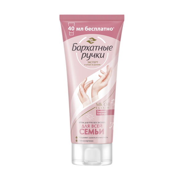 Бархатные Ручки крем уход для меня и моей семьи без запаха 200 млБренд Бархатные Ручки представляет крем для рук Для меня и моей семьи. Гипоаллергенная формула без запаха разработана специально для бережного ухода за чувствительной кожей рук и ежедневного ухода. Крем увлажняет, питает и смягчает кожу, уменьшая шелушение и признаки раздражения. Благодаря легкой текстуре, крем быстро впитывается, а отсутствие выраженного запаха и красителей обеспечивает комфортное использование для каждого члена семьи. Формула Silk Oil Elixir усиливает действие крема. Микромасла восстанавливают клетки кожи и в комплексе с протеинами шелка делают ее мягкой и нежной. Крем подходит для детской кожи: -Защита и нежный уход за детскими ладошками -Питание и увлажнение для маминых ручек -Устранение сухости без запаха и липкой пленки для папиных рук Формула Silk Oil Elexir представляет собой комплекс, состоящий из микромасел и протеинов шелка.