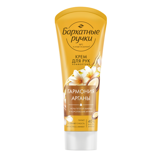 Бархатные Ручки крем для рук королевская аргана 80 млДобавьте в свой ежедневный уход новинку от бренда №1 в уходе за руками° – крем для рук Бархатные ручки Королевская аргана. Его плотная питательная текстура содержит 40% масла арганы', а также масла ши, миндальное, виноградной косточки. Масло арганы – мощный природный антиоксидант, обладает анти-стресс действием и, как источник ненасыщенных жирных кислот, обеспечивает восстановление барьерной функции кожи. Благодаря своему насыщенному сбалансированному составу крем эффективно питает и устраняет сухость. Крем имеет приятный аромат, пирамида которого стартует нотами сладкого мандарина, переходящими в аккорды загадочного жасмина и розы. База аромата – амбра и пачули. Пользуйтесь кремом для рук Королевская аргана каждый день и наслаждайтесь эффектом и роскошным ароматом восточной направленности.