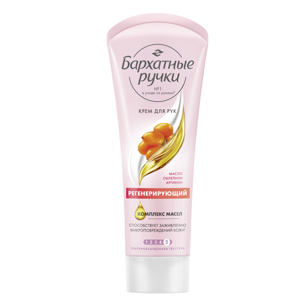 Бархатные Ручки крем для рук регенерирующий 80 млВстречайте обновленный крем от бренда Бархатные ручки с обновленным дизайном, новыми ароматами' и усиленными формулами'! Доверьте заботу о руках бренду №1* – Бархатные Ручки. Специально для интенсивного ухода эксперты бренда создали Регенерирующий крем. • Формула с маслом облепихи питает и смягчает кожу, предохраняет от обезвоживания и шелушения. • Аргинин увлажняет и стимулирует локальную микроциркуляцию. • Аллантоин смягчает роговой слой, способствуя своевременному отшелушиванию отмерших клеток. • Масло ши оказывает смягчающее, увлажняющее и питающее действие. Подходит для ухода за кожей любого типа, особенно часто используется для ухода за сухой, раздраженной, поврежденной. Замедляет старение кожи. • Комплекс масел интенсивно увлажняет, смягчает, предотвращает появление сухости. Ультранасыщенная текстура быстро впитывается, не оставляет липкости и жирной пленки. Чувственный цветочный аромат с нежными пудровыми нотами подарит особое удовольствие во время использования. Кожа рук ежедневно испытывает колоссальное воздействие разрушающих стресс-факторов. Регулярное применение крема для рук, не менее 2 раз в день, восполняет ресурсы кожи, защищая ее от микроповреждений.