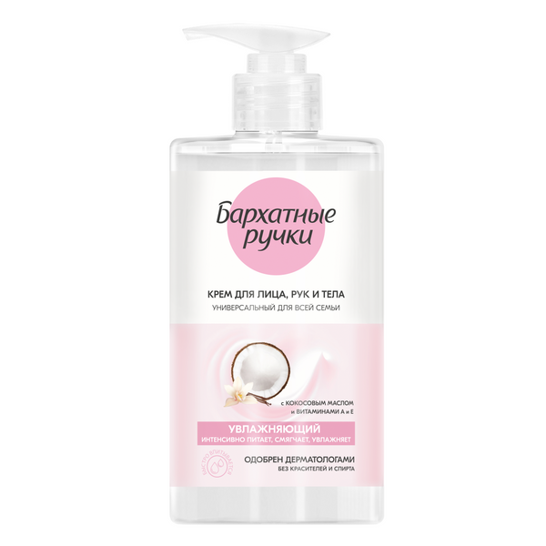 Бархатные Ручки крем для лица рук и тела для всей семьи увлажняющий универсальный 430 млЕсли вам нужен крем, который бы подошел всем членам семьи, включая детей с 3-х лет, попробуйте новинку от бренда Бархатные ручки . Универсальный крем разработан специально для ежедневного ухода за кожей лица, тела и рук. • Кокосовое масло в его составе увлажняет и питает, устраняет сухость, делая кожу мягкой и гладкой. • Витамины А и Е восстанавливают гладкость, тонизируют и придают коже естественное сияние. Витамин Е – мощный антиоксидант, поддерживающий собственные защитные функции кожи, а витамин А способствует восстановлению и сохранению упругости и эластичности. • Не содержит красителей и спирта. • Нежная текстура быстро впитывается, не оставляя ощущения липкости и жирной пленки. • Подходит даже для нежной детской кожи. Идеален для применения в любое время дня и в любой сезон. Флакона объемом 430 мл надолго хватит всей семье. Используйте дома, на даче, во время поездок на отдых и будьте уверены, что у вас под рукой есть качественное средство для восстановления и питания кожи. Крем одобрен дерматологами. Откройте для себя все секреты нежности с обновленной коллекцией кремов Бархатные ручки: невероятно притягательные ароматы, различные текстуры от нежных до супернасыщенных и по-прежнему эффективные составы.