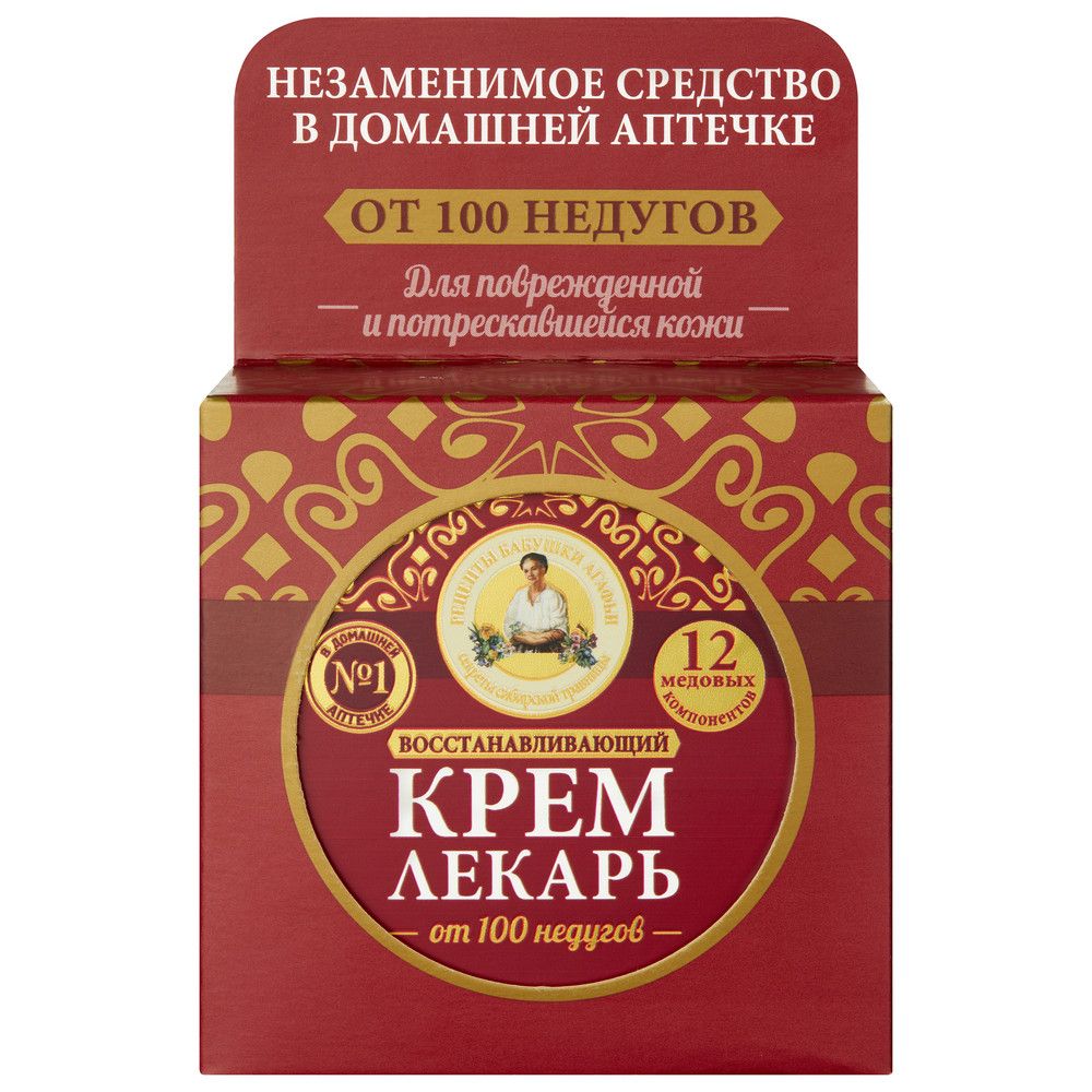 Рецепты Бабушки Агафьи крем лекарь восстанавливающий 100 млКрем-лекарь создан по традиционному рецепту сибирской травницы Агафьи. Его живительная сила заключается в уникальном составе, который состоит из 12 натуральных медовых компонентов, специально подобранных для сохранения здоровья и красоты кожи. Эти компоненты глубоко проникают в кожу, питают и активизируют процессы регенерации тканей, оказывают противовоспалительное и заживляющее воздействие, эффективно восстанавливая повреждения. Пчелиное маточное молочко содержит большое количество витаминов, минеральных веществ и аминокислот, оно глубоко увлажняет и успокаивает кожу. Перга — уникальное по своим свойствам вещество, которым пчёлы выкармливают своих рабочих собратьев. В ней содержатся все витамины группы В, каротин, природные антибиотики, а также витамин Р, стимулирующий восстановительные и заживляющие процессы в клетках кожи. Горный и алтайский мёд улучшают микроциркуляцию крови и иммунитет. Прополис оказывает антибактериальное действие. Цветочная пыльца, незаменимый источник протеинов, тонизирует и глубоко питает кожу. Пчелиный воск образует на коже невидимую плёнку, которая предотвращает обезвоживание и обеспечивает длительную защиту. Мумиё оказывает очищающее и противовоспалительное действия. Гречишный, малиновый и лесной мёд заживляют, оздоравливают и разглаживают кожу, делая её свежей и бархатистой. Крем подходит для ежедневного применения для защиты кожи лица и тела в любое время года, а также может использоваться как универсальный заживляющий и восстанавливающий крем для всей семьи.