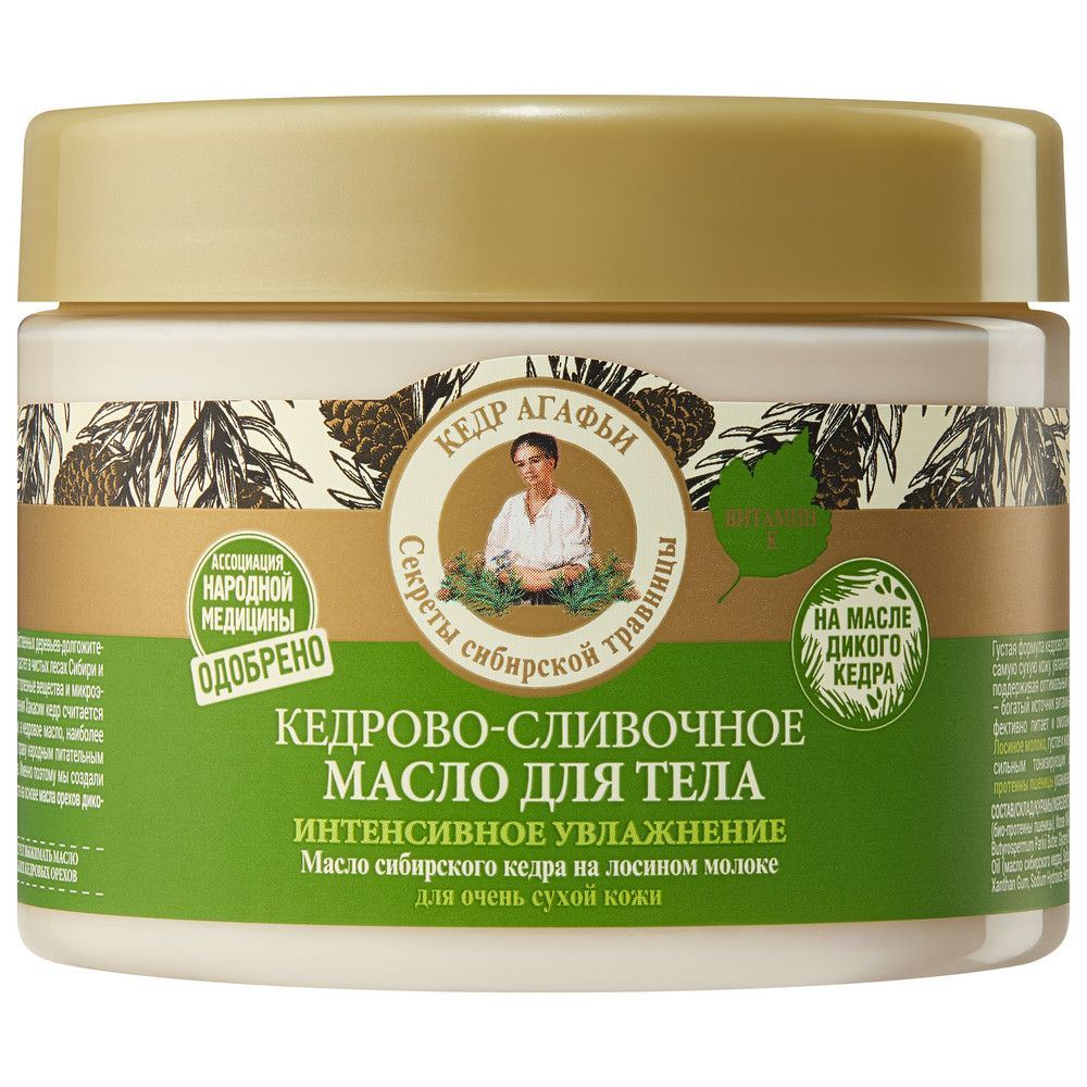 Рецепты Бабушки Агафьи масло для тела интенсивное увлажнение кедрово сливочное 300 млГустая формула кедрово-сливочного масла для тела восстанавливает даже самую сухую кожу, увлажняет её, придает ощущение мягкости и комфорта, поддерживая оптимальный уровень увлажнения. Масло сибирского кедра – богатый источник витамина Е и полиненасыщенных жирных кислот, эффективно питает и омолаживает кожу, делая ее мягкой и ухоженной. Лосиное молоко, густое и жирное, богатое витаминами и белками, обладает сильным тонизирующим и восстанавливающим действиями. Био протеины пшеницы ухаживают за кожей и предотвращают шелушение.