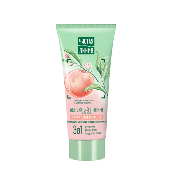 Чистая Линия пилинг для лица бережный с фруктовыми кислотами 50 млПопробуйте новинку от бренда Чистая Линия – бережный пилинг для домашнего ухода с фруктовыми кислотами. Он действует сразу в 3-х направлениях: очищает, выравнивает тон кожи и придает гладкость. • Фруктовые кислоты оказывают на кожу отшелушивающее, увлажняющее, обновляющее действие, а также стимулируют синтез коллагена. • Зеленый чай тонизирует и увлажняет, защищает от преждевременного старения, улучшает цвет лица и состояние кожи любого типа и возраста. • Экстракт персика увлажняет и смягчает. Свойства продукта подтверждены потребительским тестированием*. Так, 94% респондентов отметили, что пилинг интенсивно очищает, после использования кожа становится более нежной, мягкой и гладкой; 95% – выравнивает рельеф кожи. Подходит даже для чувствительной кожи.