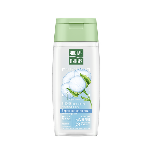 Чистая Линия лосьон для снятия макияжа с век бережное очищение с экстрактом хлопка укрепляет ресницы 100 млВстречайте обновленный лосьон для снятия макияжа от Чистой Линии с усиленной формулой1 и новым дизайном! Нежная и чувствительная кожа век имеет свои особенности и нуждается в специализированном уходе и очищении. Эксперты бренда Чистая Линия разработали лосьон для снятия макияжа с век, в составе которого 97% компонентов натурального происхождения*! Эссенция NATURE PLUS – НЕЙЧЕ ПЛЮС – это пять экстрактов и масел для ухода за кожей вокруг глаз: - Экстракт вербены восстанавливает баланс увлажненности и тонизирует. - Экстракт пиона и льняное масло успокаивают и смягчают. - Миндальное масло насыщенное жирными кислотами, витаминами Е и F, питает и выравнивает поверхность кожи. - Ферментированное оливковое масло питает и защищает от преждевременного старения. - Экстракт хлопка необходим для восстановления нежной кожи вокруг глаз и укрепления ресниц. Эффективность подтверждена**: 95% респондентов отметили, что лосьон легко и быстро снимает макияж; 92% – подходит для нежной кожи вокруг глаз; 96% – не вызывает чувства дискомфорта, раздражения на коже; 92% – дарит ощущение ухода