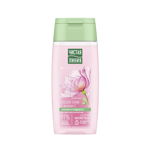 Чистая Линия лосьон тоник сияние и гладкость для сухой и чувствительной кожи с экстрактом розы и витамином е 100 млВстречайте обновленный лосьон-тоник от Чистой Линии с усиленной формулой1 и новым дизайном! Эксперты бренда Чистая Линия разработали лосьон-тоник, обогащенный экстрактом лепестков роз, с учетом особенностей сухой и чувствительной кожи. Ощутите гладкость и сияние сразу после применения продукта! В составе продукта 97% компонентов натурального происхождения*! Эссенция NATURE PLUS – это пять экстрактов и масел для ухода за кожей: - Экстракт вербены восстанавливает баланс увлажненности и тонизирует; - Экстракт пиона и льняное масло успокаивают и смягчают; - Масло миндаля содержит жирные кислоты, витамины Е и F, питает и выравнивает поверхность кожи; - Ферментированное оливковое масло питает и защищает от преждевременного старения; - Экстракт лепестков розы и витамин E успокаивают, придают коже гладкость и здоровое сияние. Свойства подтверждены результатами потребительского тестирования**: - 80% респондентов отметили, что тоник нежно освежает кожу лица; - 68% – дает ощущение максимального комфорта и свежести; - 88% – кожа выглядит отдохнувшей и свежей в течение всего дня; - 72% – цвет лица ровный сияющий. Одобрено дерматологами
