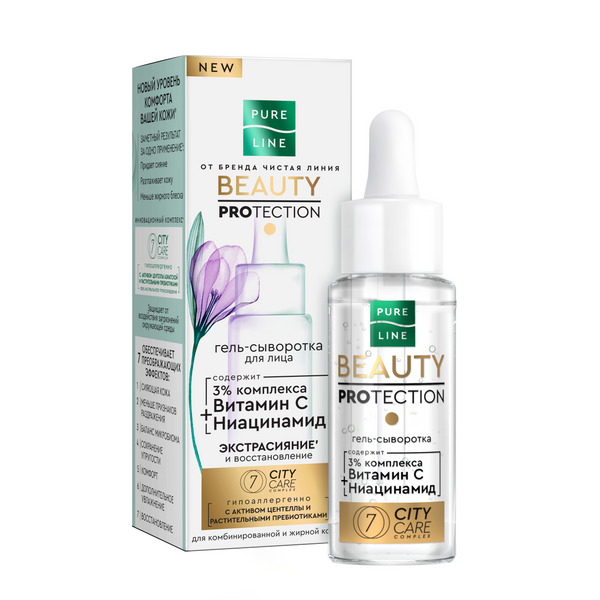 Чистая Линия гель сыворотка для лица с ниацинамидом и витамином c 30 млНовый уровень комфорта' вашей кожи с Pure Line от бренда Чистая Линия активирует ее естественные механизмы защиты! Гипоаллергенная гель-сыворотка разработана с учетом всех потребностей жирной и комбинированной кожи. Невесомая гелевая текстура легко впитывается и не оставляет жирной пленки. В составе продукта: • 3% комплекса с витамином С, который повышает эластичность, придает коже сияние и здоровый цвет, и ниацинамидом, улучшающим микроциркуляцию и снимающим раздражение; • Комплекс 7 CITY CARE 100% натурального происхождения с активом центеллы азиатской и растительными пребиотиками защищает от воздействия загрязнений окружающей среды и обеспечивает 7 преображающих эффектов: сияющая кожа, меньше признаков раздражения, баланс микробиома, сохранение упругости, комфорт, дополнительное увлажнение, восстановление. Уже после первого применения вы заметите*: сияющая, ровная кожа, жирный блеск сокращен. После того как используете гель-сыворотку, отправьте флакон в контейнер для пластика или вторсырья. Он пригоден для переработки.