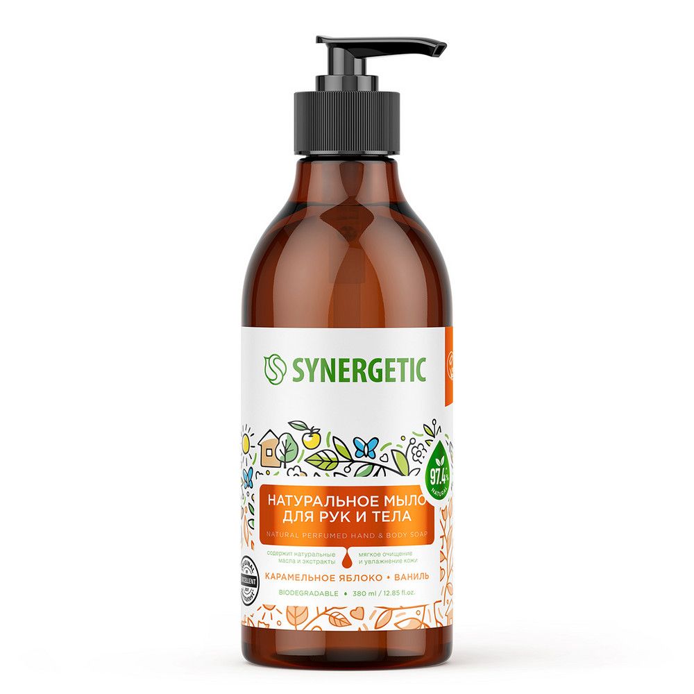 Synergetic жидкое мыло карамельное яблоко и ваниль 380 млНатуральное биоразлагаемое мыло для рук и тела SYNERGETIC "Карамельное яблоко и ваниль" - это деликатное средство для очищения кожи с высокой концентрацией натуральных компонентов в составе. Гипоаллергенный аромат натурального мыла разработан в швейцарском доме Givaudan с использованием натуральных эфирных масел померанца, корицы и лимона. Масла макадамии, гранатовых косточек и экстракты ванили и яблока оказывают регенерирующее действие, питают и увлажняют сухую кожу, делая ее гладкой и бархатистой. Мультифункциональный компонент натурального происхождения софоролипид мягко очищает и сохраняет естественный микробиом кожи. Уникальный комплекс натуральных компонентов обеспечивает длительный смягчающий эффект до 72 часов. Физиологичный уровень pH 5,5 гарантирует мягкость кожи и безопасность при частом использовании даже для чувствительной кожи. Мыло дерматологически протестировано независимым исследовательским институтом Dermatest®️ в Германии. Средство не содержит SLS, силиконов, минеральных масел, красителей и компонентов животного происхождения, не тестируется на животных и сертифицировано британской организацией The Vegan Society. Знак Vegan – мировой стандарт этичной продукции.